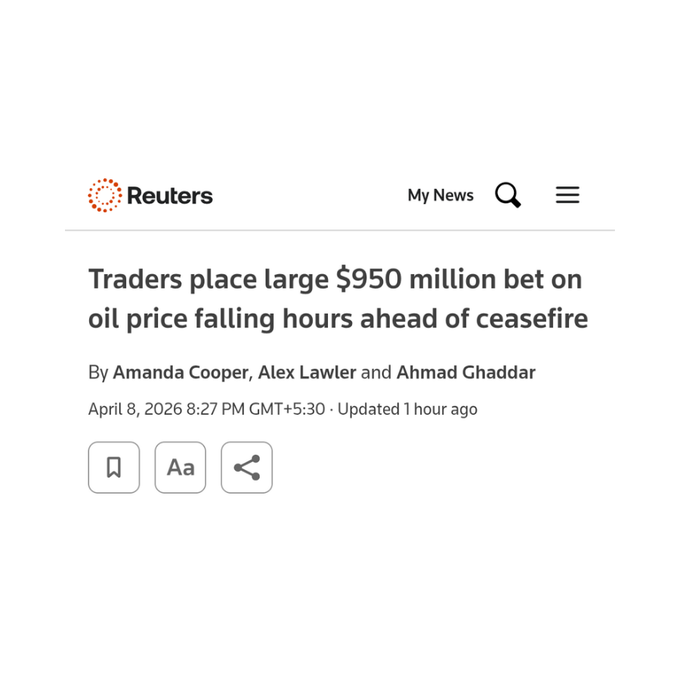 وفقاً لما نقلته Reuters، تم تنفيذ صفقة ضخمة بقيمة 950 مليون دولار على هبوط أسعار النفط قبل ساعات فقط من إعلان دونالد ترامب وقف إطلاق النار مع إيران.