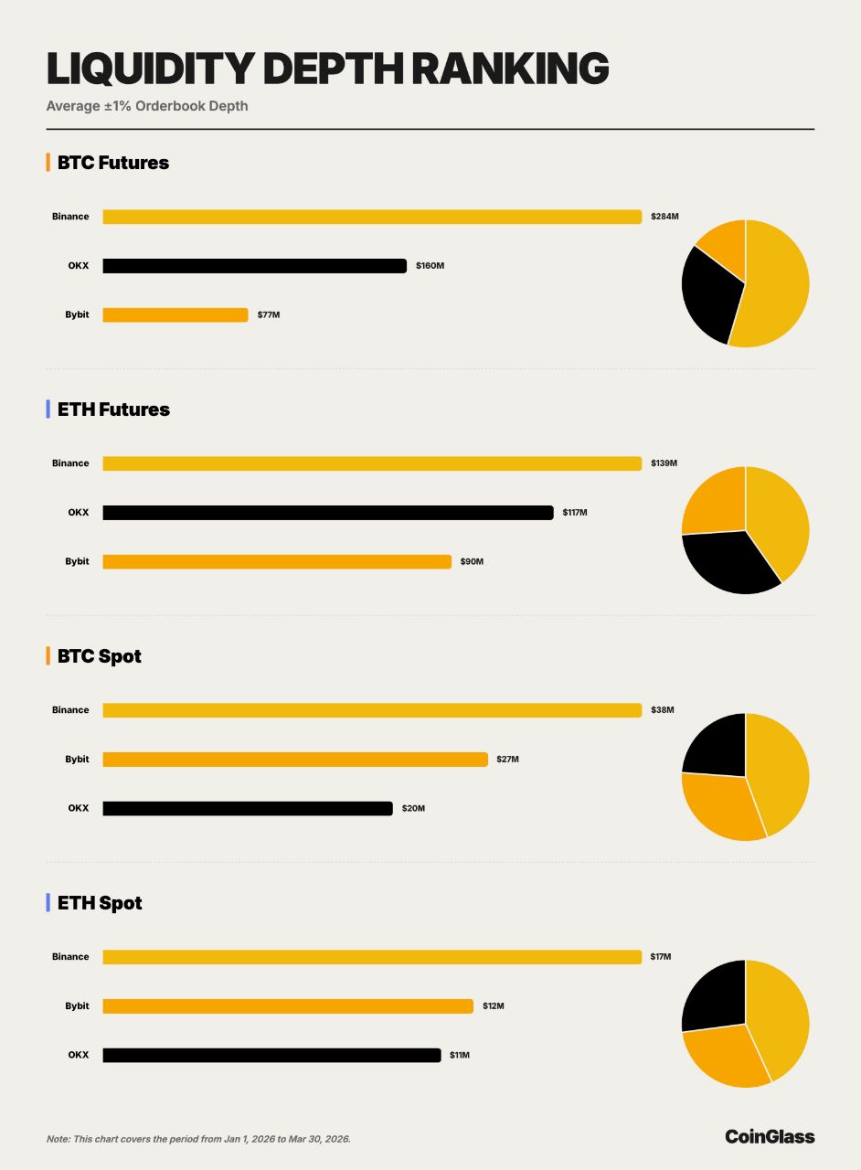 أما من حيث عمق السيولة، فقد أظهرت البيانات تفوقاً واضحاً في أسواق العملات الرئيسية مثل البيتكوين والإيثريوم، سواء في السوق الفوري أو أسواق العقود.